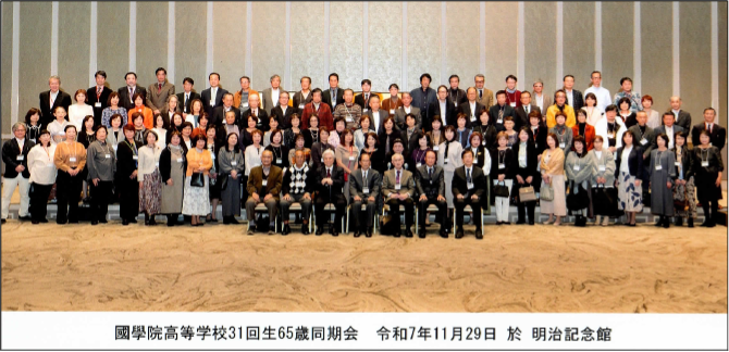 令和7年11月29日土曜日、明治記念館富士の間にて第31回生65歳同期会を開催しました。本来は還暦を迎える5年前に開催予定でしたが、当時世の中はコロナ感染拡大による宴席自粛の波が押し寄せており、同期会もあえなく中止となりました。しかしながら、今回、國學院高等学校同窓会の特別なご配慮により5年遅れの65歳での同期会開催をご承認いただきました。